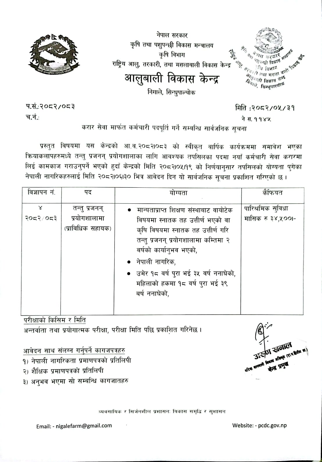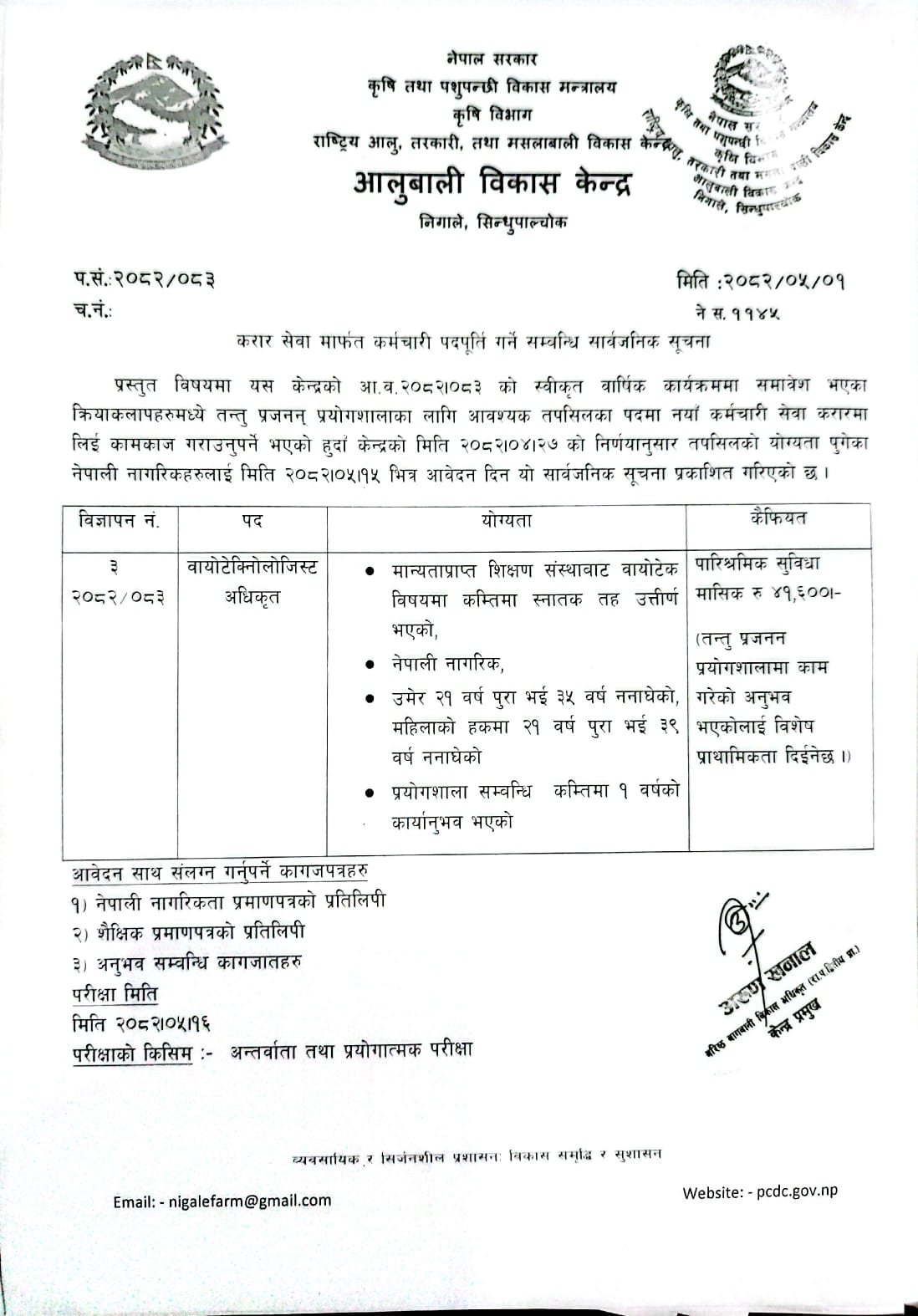 वायोटेक्नोलोजिष्ट अधिकृत पदको पदपूर्ती सम्बन्धी सूचना २०८२