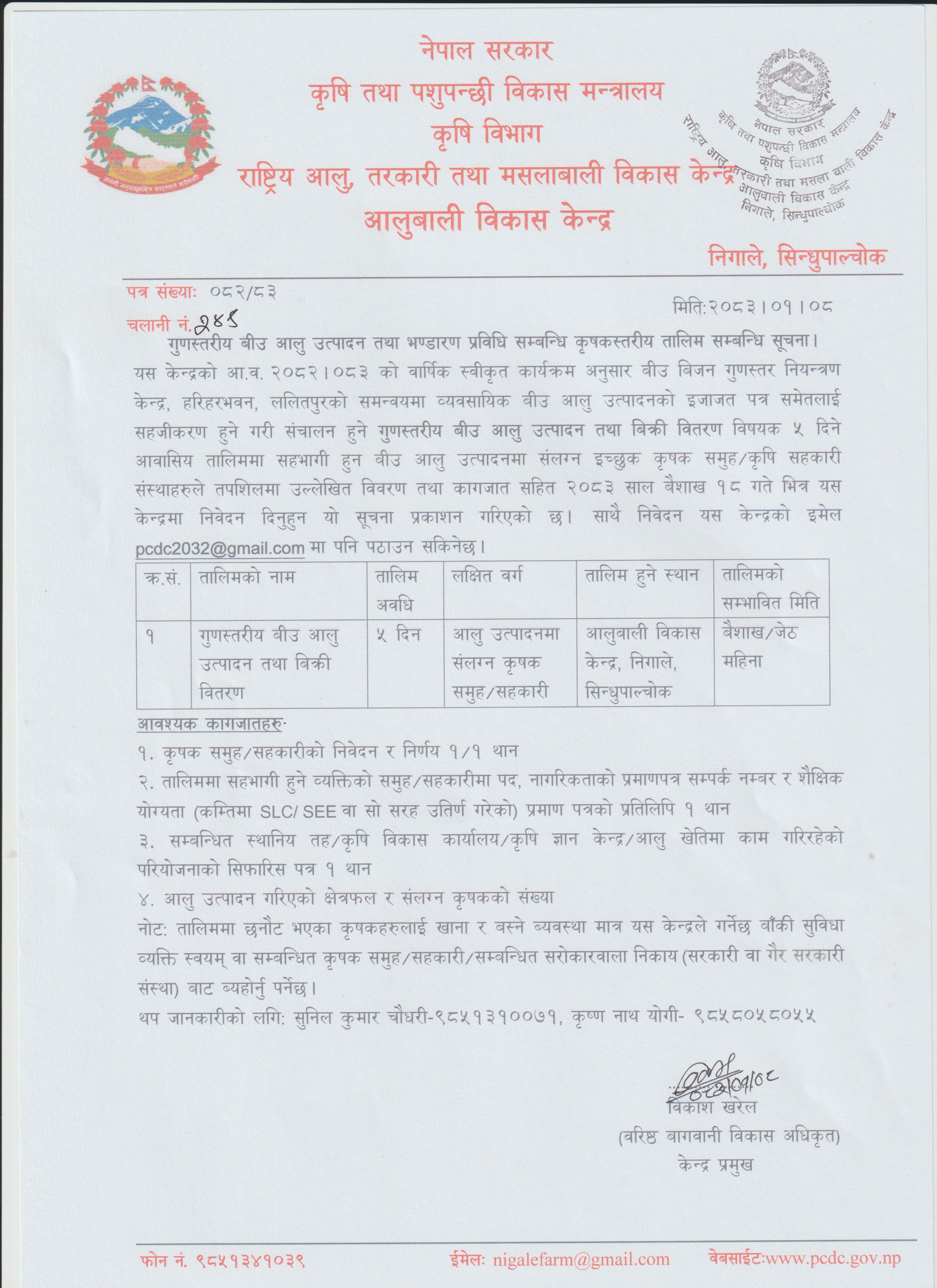 संघ, प्रदेश तथा स्थानिय तहहरुमा कार्यरत कृषि प्राविधिकहरुलाई बीउ आलु उत्पादन सम्बन्धि 3 दिने तालिमको सूचना।